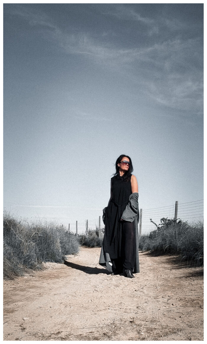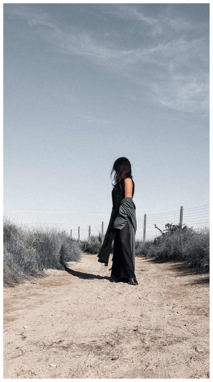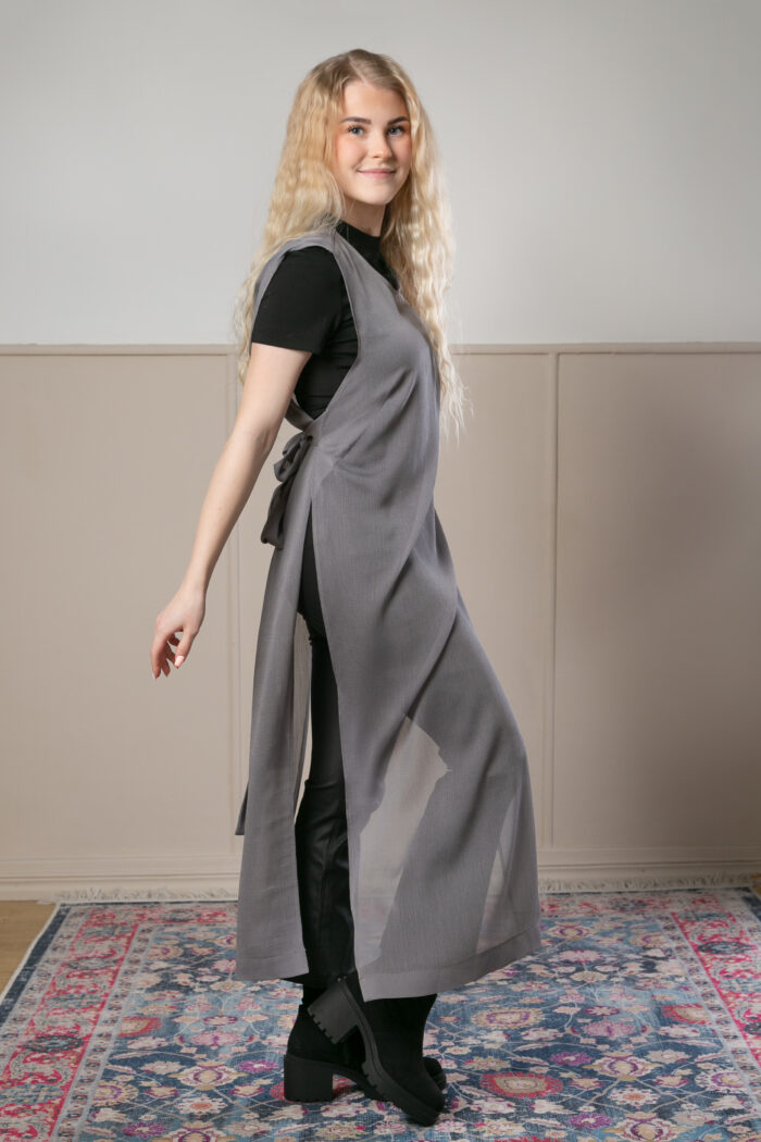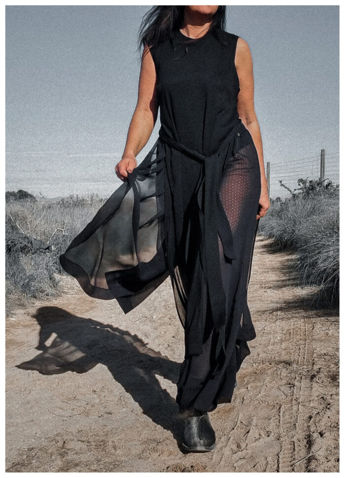Musta värvi komplektiga piltidel on hõlsti all samast šifoonkangast läbikumavad pikad püksid ja mustriga sukapüksid. Komplekt on pehme, õhuke ja ei kortsu.
