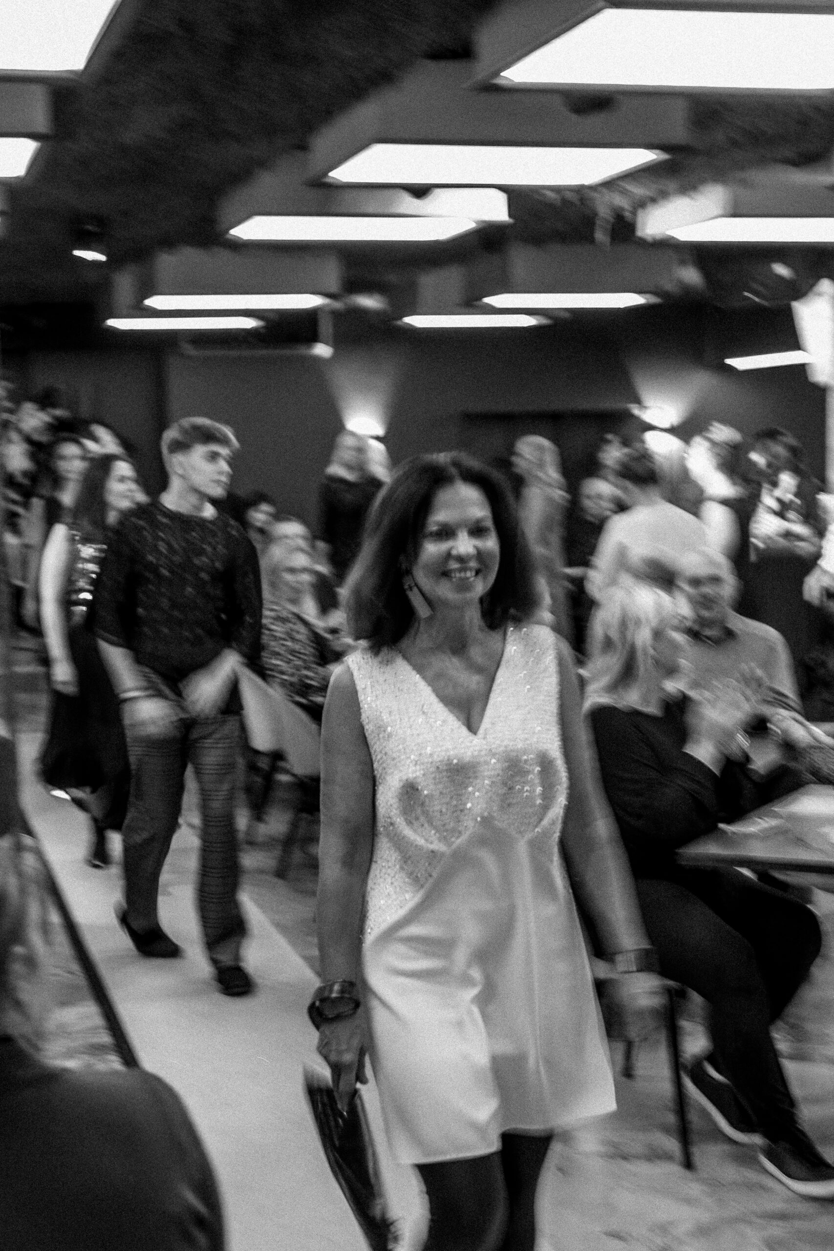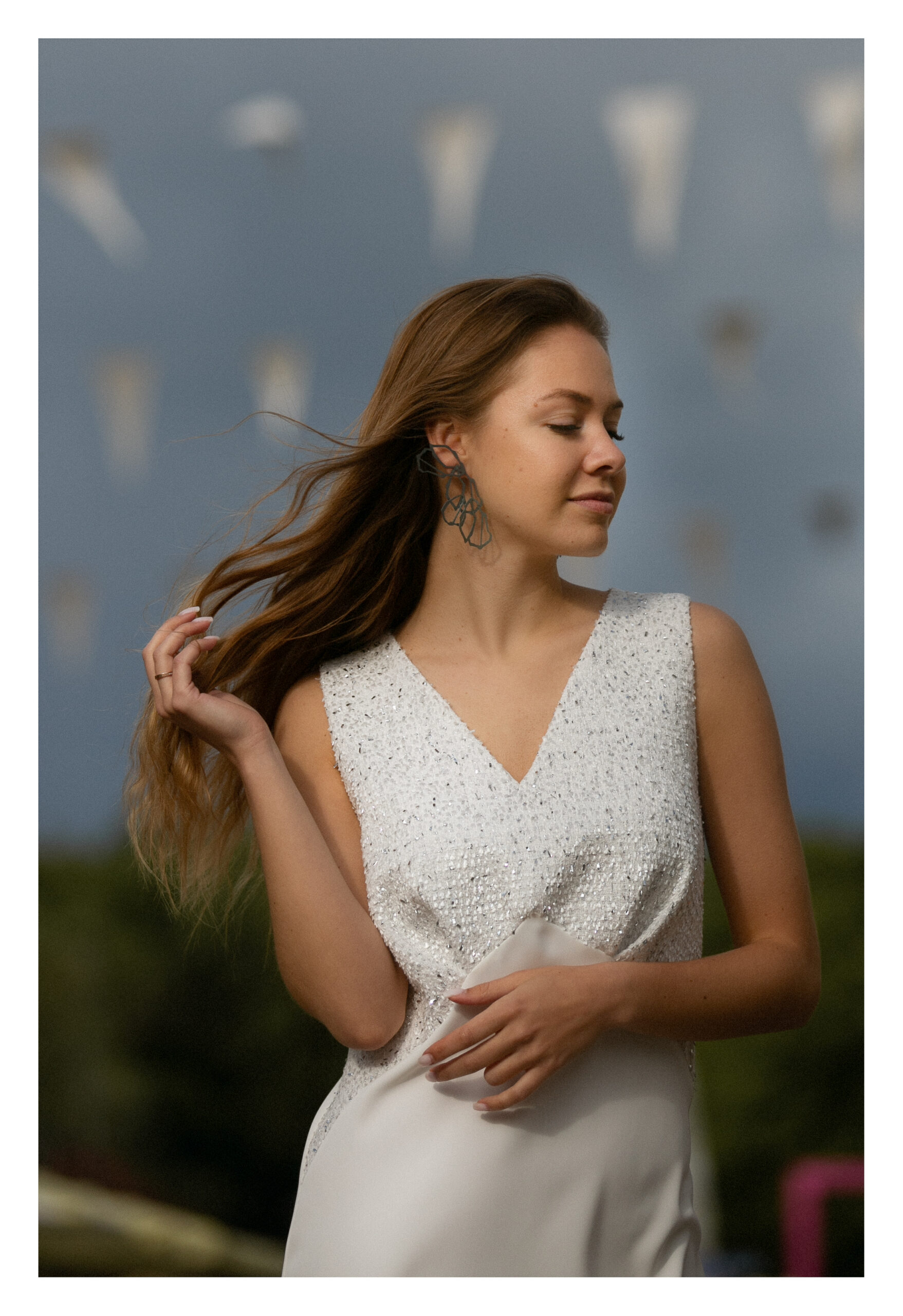 See stiilne ja naiselik valge minikleit ühendab endas lihtsuse ja elegantsi. Ülemine osa on kaunistatud hõbedasest metallkiust koosneva tekstuurse kangaga, mis annab kleidile piduliku sära. Alumine osa on siledast, kangast, mis loob kauni kontrasti ja lisab liikumisel kergust.
